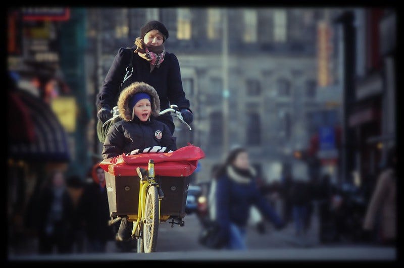 O próximo passo na evolução do transporte de crianças é a Bakfiets, a bicicleta-caixote.