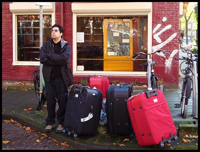 (Foi o que aconteceu comigo: a minha esposa veio para um emprego na Holanda e eu vim junto como uma mala extra, embora eu pese bem mais que os 32kg de bagagem permitida nos voos da KLM da época).